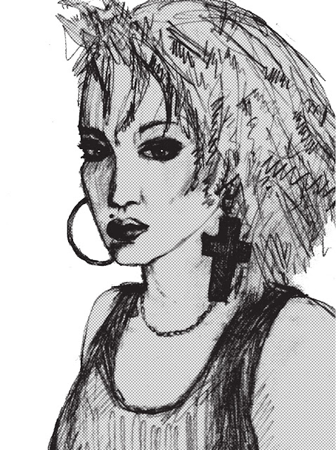 A straightforward sketch wasn't quite enough for me, especially as it kind of looks like Madonna but also kind of doesn't. So I created the following text, drawing by hand and colouring in black fine line.